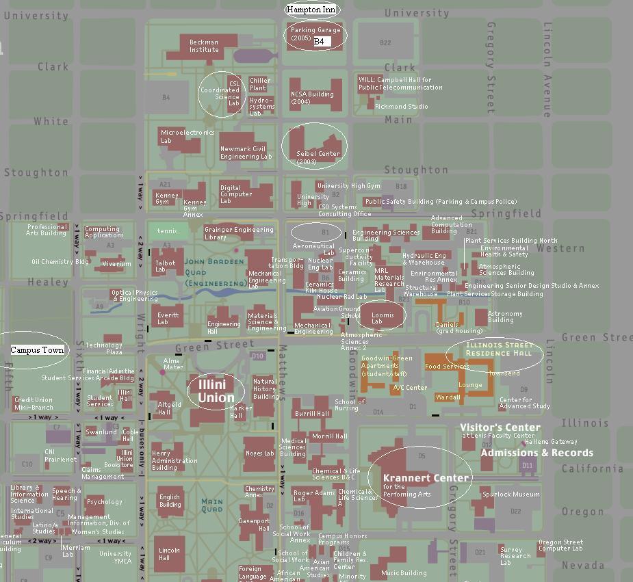 - UIUC North Campus Map with highlights on Hampton Inn, Illini Union, Illinois Street Residence Hall, Loomis Lab, Coordinated Science Lab (CSL), Krannert Center for the Performing Arts, Parking Lot B1, B4, and D5.